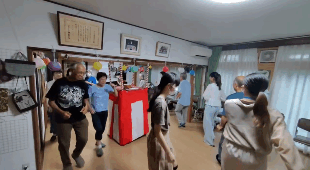 今年は、6月から猛暑続きで、リフレッシュ体操も8月半ばに夏休みを頂くことになり、お休み前のミニイベントで、昨年同様、室内で、メンバーさんとおむすびの運営スタッフ、そしてボランティアセンターの職員さんや学生さんたちも来て下さり、一緒に盆踊りを行いました。