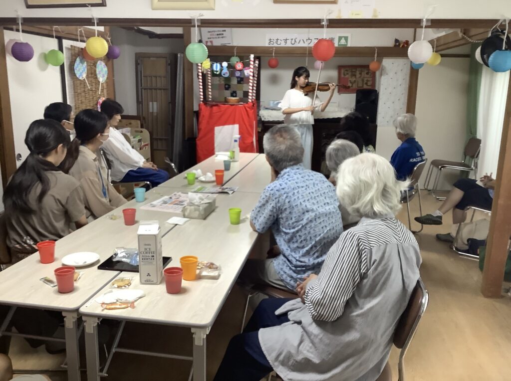 盆踊りの後には、アイスやスイカなどを食べたり、昨年もお手伝いに来て下さった中学2年生の方が楽しく馬に関するお話をして下さったり、高校2年生の方は、「愛の挨拶」「チャールダッシュ」の曲をヴァイオリンで弾いてくださり、とてもお上手で皆さんで、感心、感動しました。