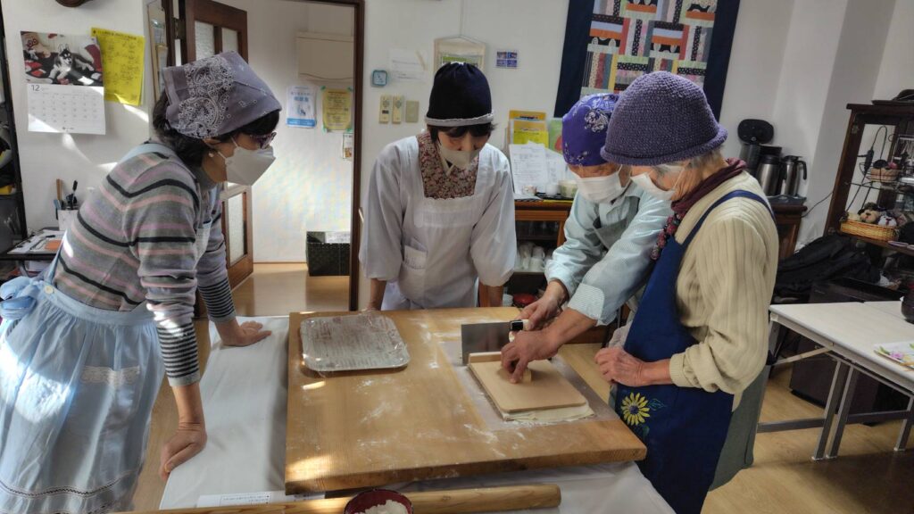 粉をこねる時の水加減や生地を均一に伸ばして、目標の2mmくらいの厚さにしてマッチ棒くらいの細さに切っていくのは、なかなか難しいですが、回数を重ねるごとに上手くなってきて、ゆでてもぷつぷつ切れることもなく上手に出来上がりました。