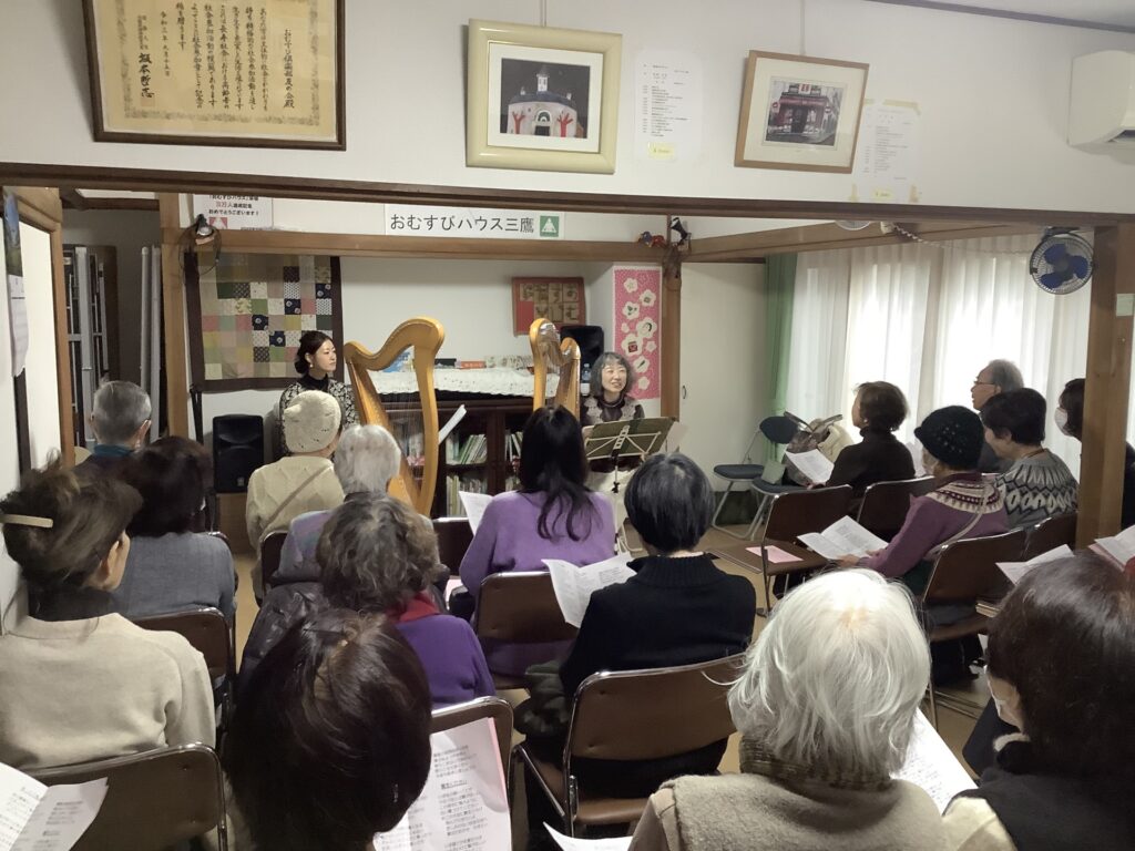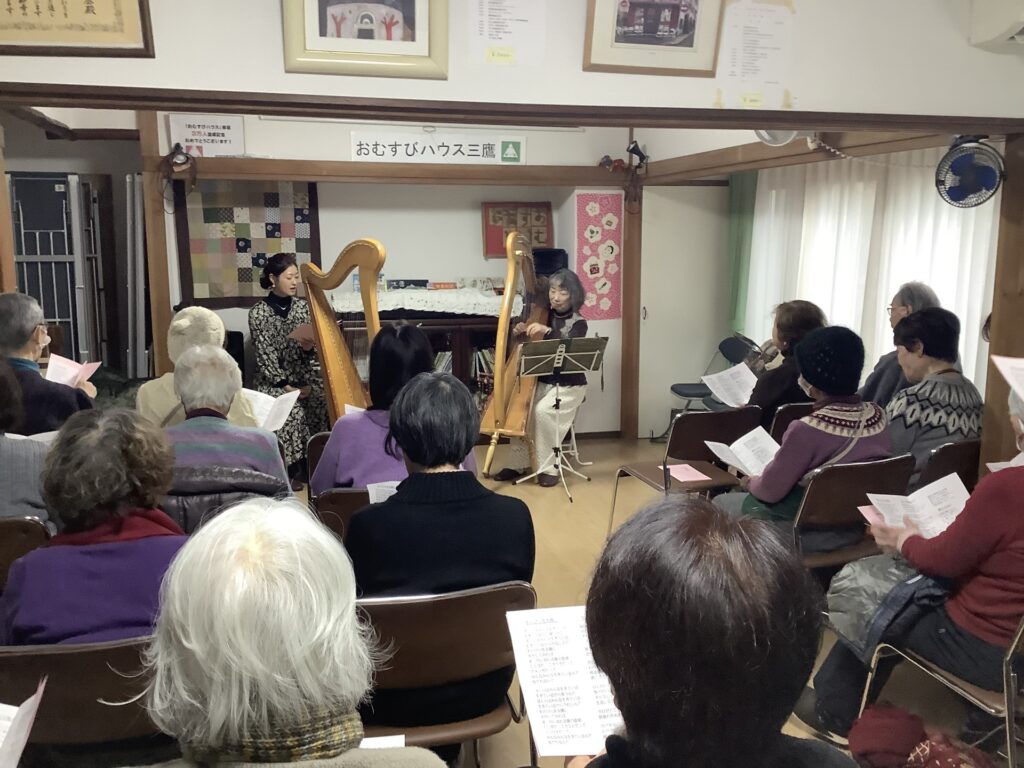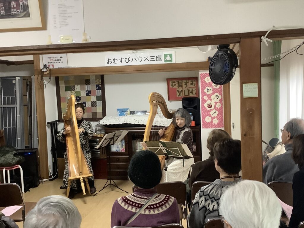 おむすびハウスで演奏していただくのは今回で6回目になりますが、今年度も2月7日(土)、市内にお住いの柴﨑なおみさんと姪御さんの服部亜麗沙さんにアイリッシュハープの演奏に来ていただくことができました。